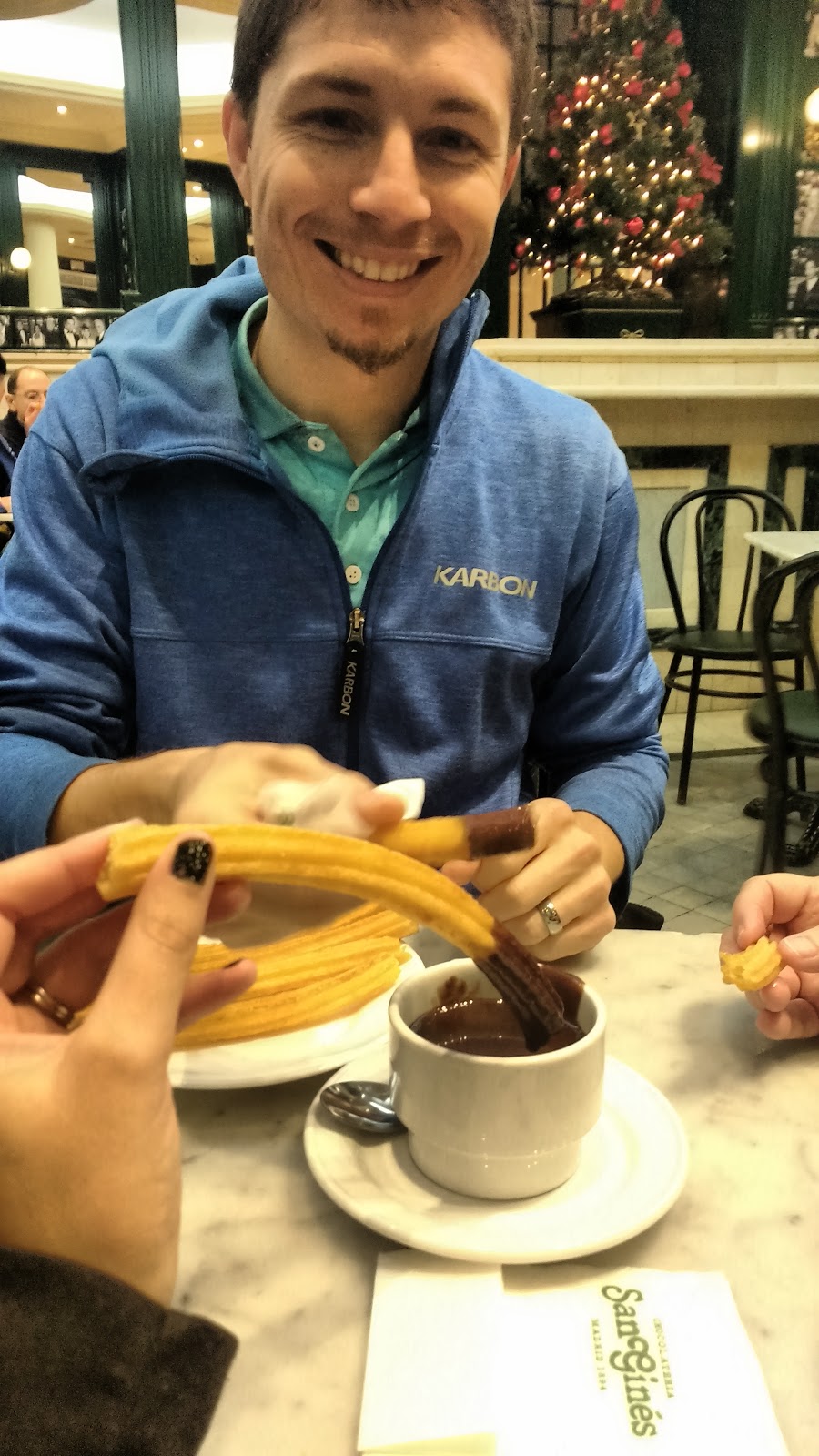 We were by this point quite tired, our feet were wet, and it was time to dry off. The best place for that was Chocolateria San Gines: the go-to spot for chocolata con churros in the Spanish capital.